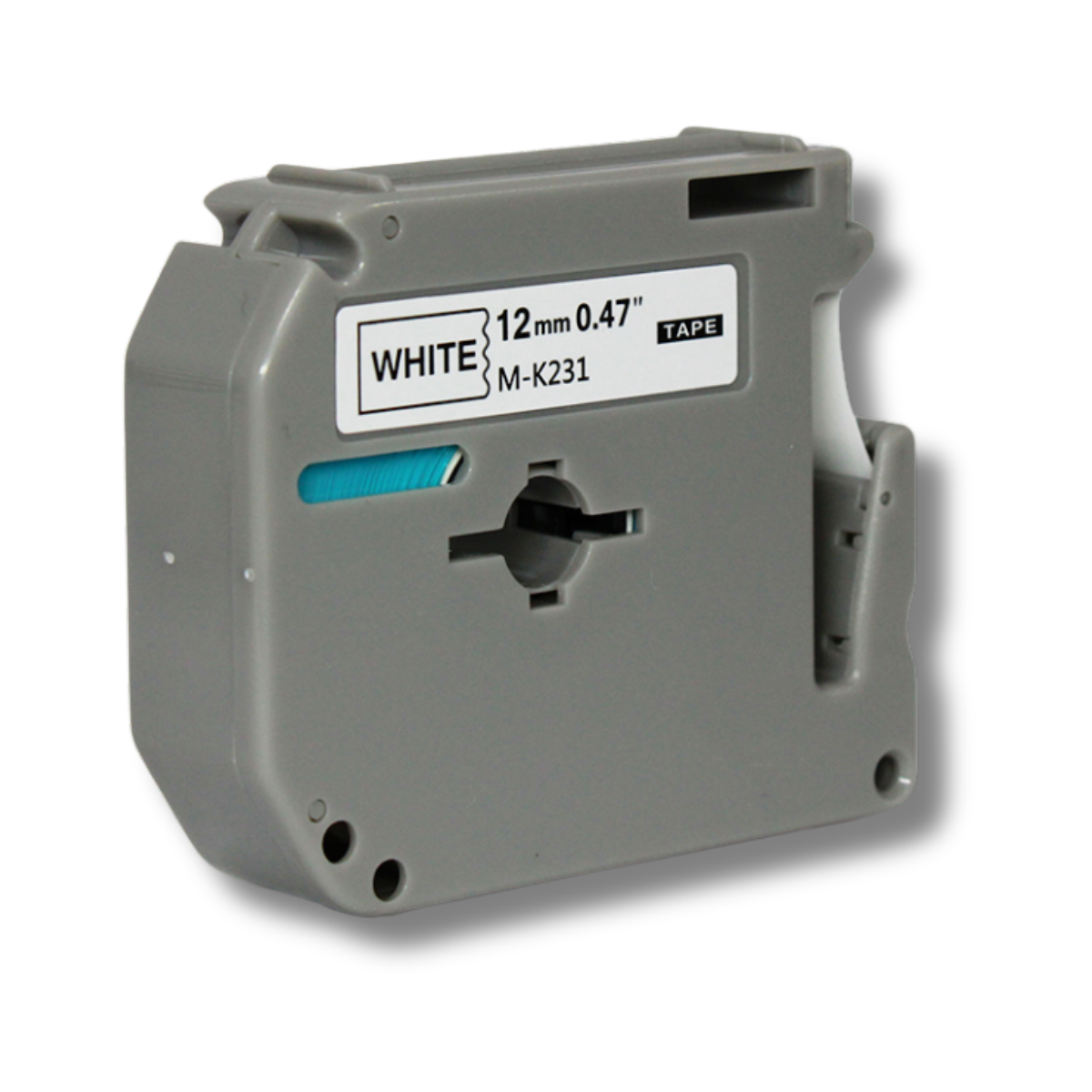 Fita de etiqueta compatível com os modelos Brother M-231 e MK-231. Ideal para rotuladores eletrônicos e etiquetadores que utilizam fitas da linha "M". Impressão em preto sobre fundo branco, perfeita para identificação e organização de diversos ambientes.